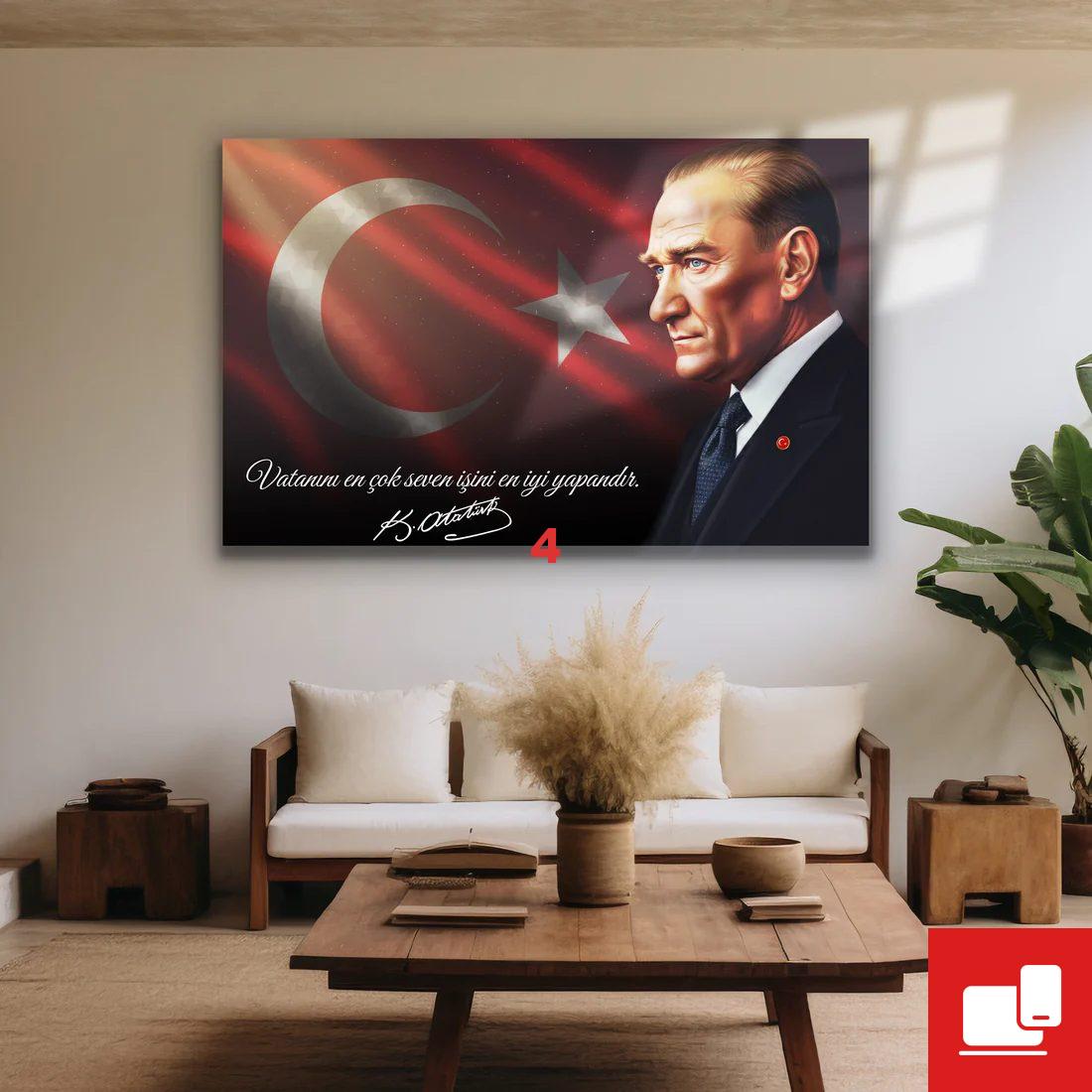 Atatürk temalı cam tablolar, evde oturma odası, çalışma odası veya giriş alanı gibi çeşitli mekanlarda kullanılabilir. Bu tablolar, hem estetik bir dokunuş sağlar hem de misafirlerinizi etkileyen bir atmosfer yaratır.